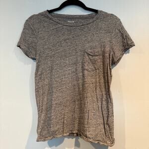 Madewell Whisper Cotton Short Sleeve Pocket Tee in Grey Heather, size Small. This tee is a classic and versatile addition to any wardrobe, made from soft whisper cotton for comfortable wear. It features a simple short-sleeve design with a single chest pocket, perfect for everyday casual outfits. Excellent pre-owned condition with no visible flaws.