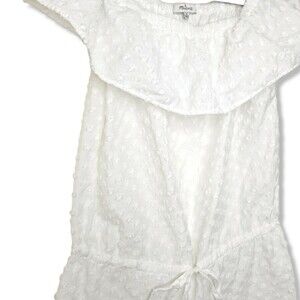 Madewell White Swiss Dot off-shoulder Romper Womens Size Medium with elastic drawstring waistband. The romper can be worn off the shoulder or on the shoulder. Romper is in great pre-owned condition! Like new! Please see the photos for approximate measurements.