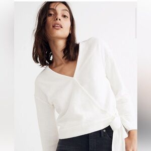 This elegant white wrap long sleeved blouse offers a chic and comfortable style. Perfect for any occasion, it features a flattering wrap design. Size Medium. Model is a size small, 5’4 for reference! Perfect Condition. Smoke/pet free home. Follow @HandpickedbyHannah on Facebook for more!