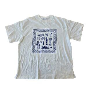Short sleeve tee with artistic blue graphic. Comfortable and stylish.