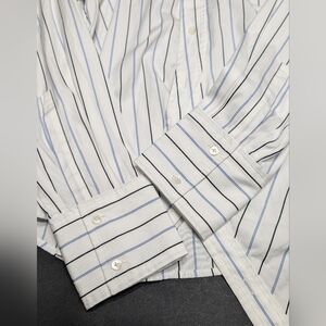 This Madewell button down shirt features a crisp white and blue hydrangea pinstripe pattern, enhanced by a unique asymmetrical wrap design at the waist. The structured fabric and classic collar make it a versatile choice for both formal and casual occasions.