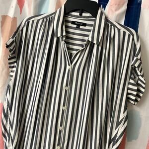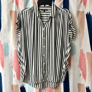 • Other information: White and gray/black striped button front shirt. Collared. Short sleeves that have the appearance of being rolled. High low hem. Oversized fit. Hand wash.