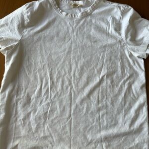 White tee is more structured and hardly see through at all. It’s a size medium and is fitted.