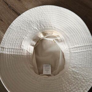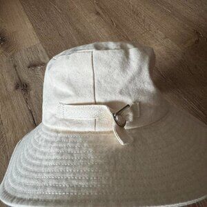 white bucket hat, adjustable strap, cotton blend, outdoor accessory, travel hat, packable, nature-inspired, casual wear, sun protection, minimalist style