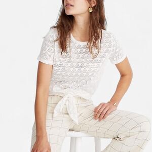 Sweet and easy, this Madewell top features a geometric eyelet design with a tie-front detail for that effortlessly polished feel. Short sleeves, lightweight cotton, and a flattering knotted hem — perfect with high-rise denim for an elevated everyday look. Pre-loved, good condition.