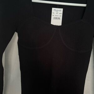Coming in a wide ribbed stitch, this long-sleeve top has a flattering slim fit and face-framing bustier neckline, and gives a nod to a corset with underbust seaming. A fine balance of comfy and cute.