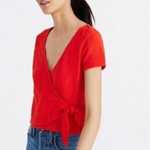 Madewell Women Size XXS Cotton Red Wrap Tie Terry Cloth Textured Cropped Shirt