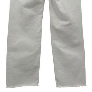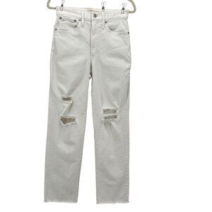 Madewell The Perfect Vintage Straight Jeans - 5-pocket style high rise white straight leg denim jeans. Button & zipper closure. Decorative rips on the front. Raw hem leg openings. Material has a stretch. Cotton Blend.