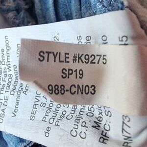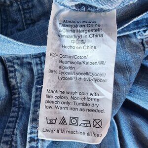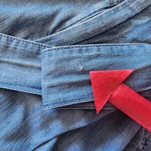 Straight leg ankle denim paper bag high rise pants - shade of medium distressed denim wash blue. Button & zipper closure. Partial elastic waist & has belt loops. Pleated front style. 2 front pockets & 2 back pockets. Removeable tie belt. Cotton & Lyocell blend. Condition: Pre-owned, has very minor wear on inside of belt not visible when tied, see photos for condition Measurements: Approximately 15.5" side to side (partial elastic waist & belted), 15" rise, 26" inseam, 8" side to side leg opening Shipped: 15 x 12 x 1 poly #14 ounces