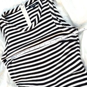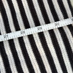 This is a beautiful, classic sleeveless cotton dress in a unique knit style. The dress is just as soft and comfortable as it is stylish and classic. The pattern is a very deep midnight blue and light cream stripe, very close to a black and white stripe. See pictures for side-by-side comparison of black fabric and the deep blue. The closure is a hidden zipper up the back.
