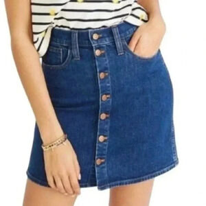 This Madewell Women's Annetta Wash Button Front Stretch Denim Straight Mini Skirt in size 32 features a solid blue color with button closure. The skirt is made of a cotton and elastane blend, providing stretch for a comfortable fit. With a mid-rise and mini length, this skirt is suitable for casual or travel occasions and can be machine washed. The denim fabric type and button accents add a stylish touch to this versatile skirt, perfect for all seasons.