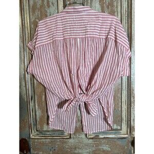 Cute and breezy Madewell women's button down top. Pink and white stripes. The back is split, and you can tie it in a knot so that its cropped in the back, or you can leave it long like tails. You could also wear both the back and the front knotted at the waist. Lots of options, super cute summery breezy top. I especially like the sides. Please see photos for details. I see no stains or flaws. Size L