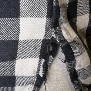 Black and white checkered button down flannel shirt. In fair condition. Stains in front and small rip on side slit.