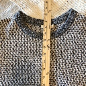 This is a Madewell pullover sweater in a size small. It is black and white knit with stripes/color block. It is in good condition with some light pilling. It is a cotton blend.