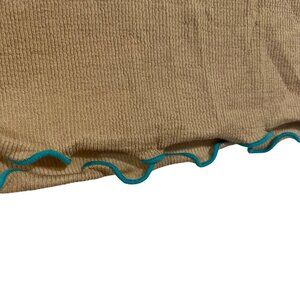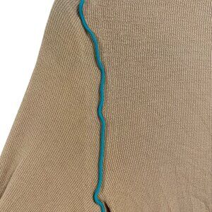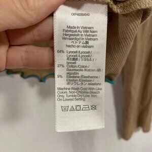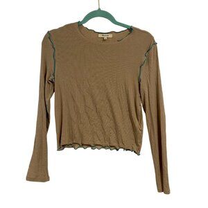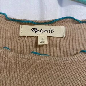 This Madewell crop top in size S features a stylish contrast stitch. Made from a soft blend of 64% Lycocell, 27% Cotton, and 9% Elastane, it offers comfort and stretch. Tan with turquoise stitching, in good condition.