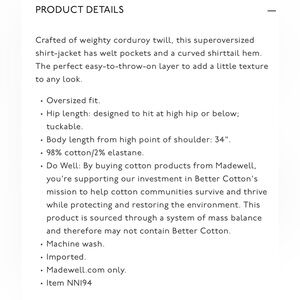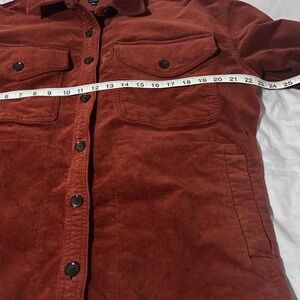 Chic corduroy button down shirt jacket by Madewell. Rich deep rust color. Perfect for layering. Oversized fit.