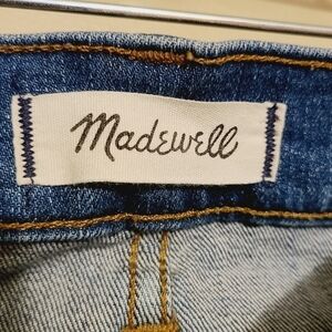 At once relaxed and refined, these just-right straight jeans with distressed hems have a French-lady-with-a-capsule-wardrobe feel. Women's medium wash, distressed, button fly, high waisted Slim Straight jeans by Madewell, size 24. Five pocket jeans. Style and care tag missing, but feels like cotton and spandex blend. Slight distressing throughout, but rips/distressing on bottoms of jeans. Please see close-up pictures for more details. Excellent pre-owned condition; no flaws outside of intentional distress.
