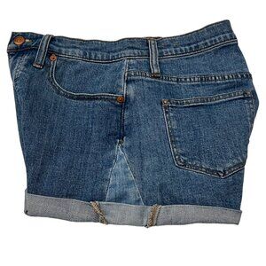 These high-rise denim shorts feature a cutoff rolled hem, zip button fly, 5 pockets, copper hardware, and added side denim detail. Excellent condition. Medium wash, size 27
