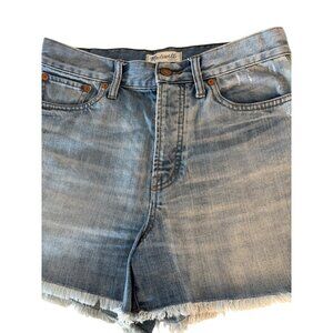 Denim shorts from Madewell offer a classic high-rise fit with stylish frayed hems. The light blue color and distressed details add a modern touch.