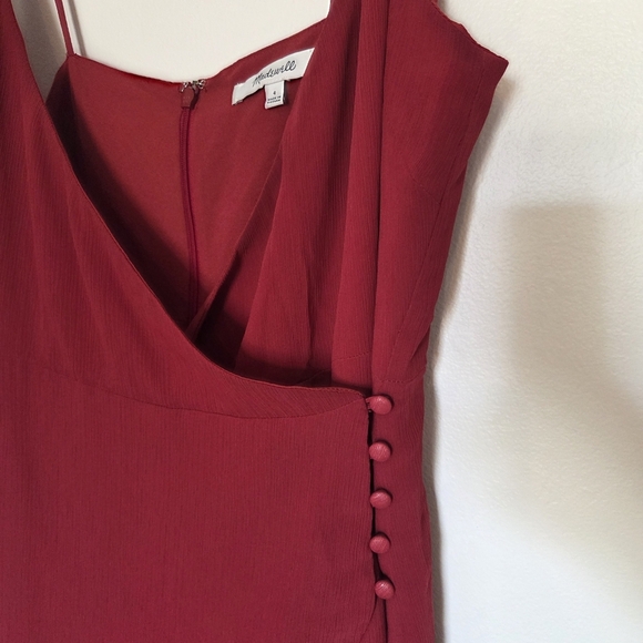 This is a Madewell brand, size 4 dress in a rich burgundy/deep reddish-maroon color. The material appears to be a lightweight, possibly chiffon or crêpe-like fabric with a subtle texture. There is a slight pull in the fabric pictured.