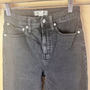 These Madewell jeans are a women's size 24 in a classic straight style. They feature a high rise and are made from dark-wash black denim. The jeans include a straight leg design, classic five-pocket styling, and a button and zip fly closure with belt loops. Suitable for casual outings or everyday wear, these jeans offer a regular fit. They are pre-owned.