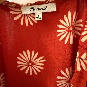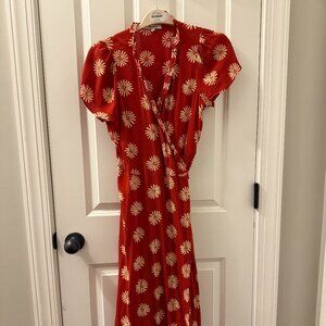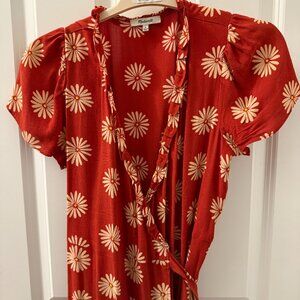 This Madewell dress is a beautiful wrap design with short sleeves and a midi length. It's the perfect fall reddish-brown color with white sunflowers. It has only been worn a handful of times and is in great condition! Style it with sandals and a tote for a casual look, or elevate it with a pair of slingbacks for a more dressy look.