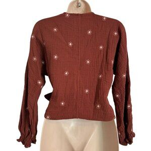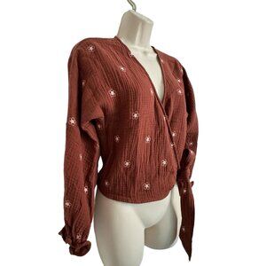 Madewell Wrap Gauze Cotton Side Tie Blouse Embroidered Pink Flowers Size XS