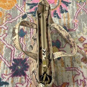 Made of textural snakeskin embossed leather, this bag has detachable shoulder strap and top handles (we do love options).