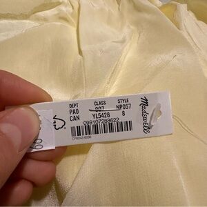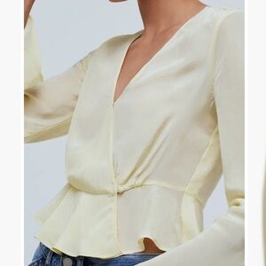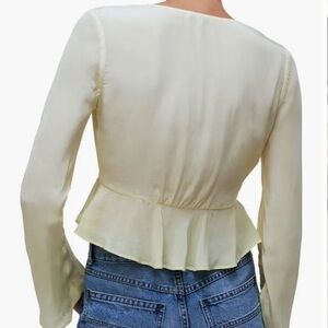 de Chine, this true wrap top has flowy bell sleeves and a romantic ruffled hem.