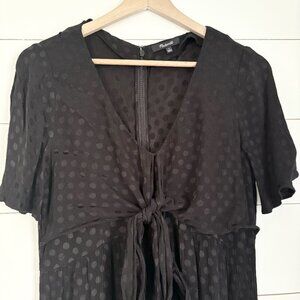 Madewell black with monochromatic polka dots jumper. This is such a cute jumpsuit with the subtle dots. Has a tie in front at the bust and zipper closure in back. This would be a perfect outfit for the holidays. Could be dressed up or down. Excellent condition, size 4