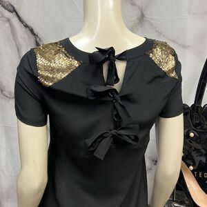 Madewell black silk shift with bronze sequence shoulders excellent condition no damage bust measures 18 inches across shoulder to bottom 35 inches