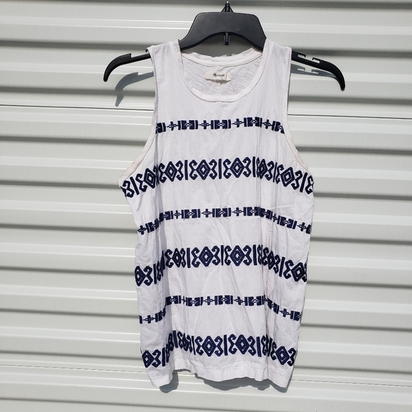 Madewell blue and white embroidered tank top 100% cotton Size XS Minor discoloration at armpits shown in pictures