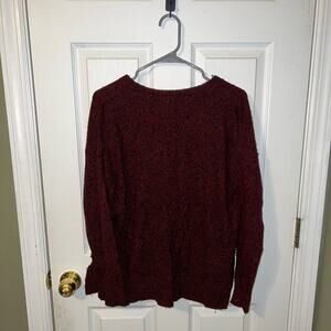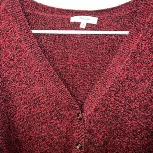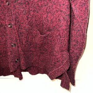 Madewell button up cardigan, in good used condition, red and black speckled color, has pockets and small slits up the side, size medium