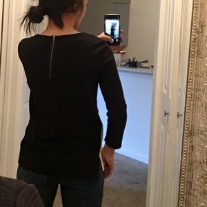 3/4 sleeves, thick ribbed fabric. Black, navy and cream colorblocking, zipper back.