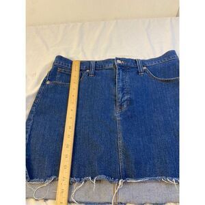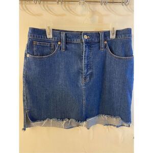 Madewell denim Jean skirt size 31 distressed hems. measures 17" waist. 15" front hem. 17" bak hem. 98 cotton. lightweight.