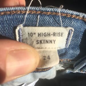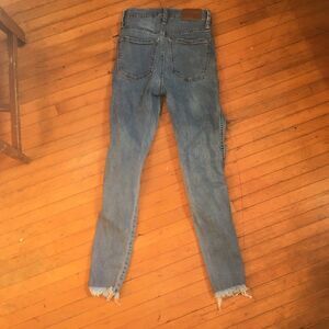 Light high rise skinny jeans. Distressed on both legs, one of the holes is pretty large. Approximately 12 inches across the waist, 27 inch inseam. From a pet and smoke free house. Happy to bundle!