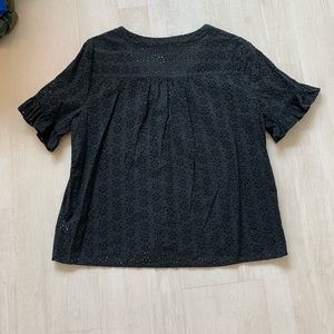 Madewell eyelet village ruffle-sleeve shirt in size small in black. The top shown in purple is only for size reference. Worn twice and kept in great condition. No longer available online for purchase. Kept in a smoke free home. All offers welcomed :)