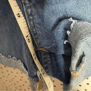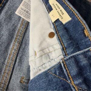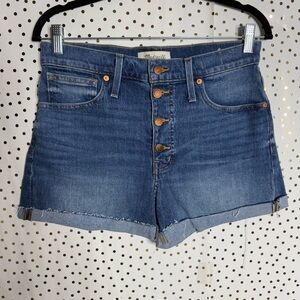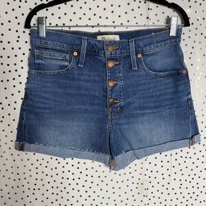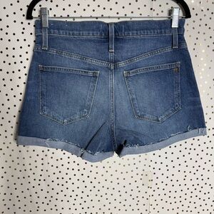 These Madewell jean shorts in a classic blue hue offer a high-waisted fit with a stylish cuffed hem. Crafted from quality denim, they provide a comfortable and flattering fit through the hips, perfect for casual outings.