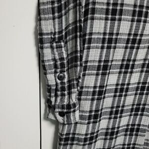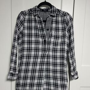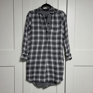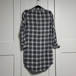 A black-and-white plaid shirtdress with a leg-flaunting longer-in-back hem. A timeless popover style in dress form, it's made of a special lightweight double-faced fabric that's houndstooth check on the flip side (aka it's made for sleeve-rolling).
