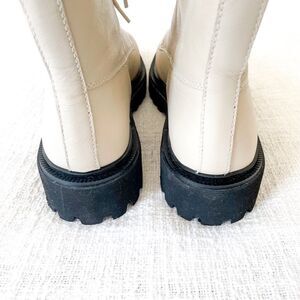 This listing is for a pair of combat-inspired lace-up boots from Madewell. Crafted of leather with a rugged lug sole, this utilitarian pair is ready to be worn any and everywhere—no matter the weather. These boots come in a cream/off-white color with chunky black soles. With hardly any signs of wear, they are in amazing condition! Truly looks like they've never been worn. These boots are a US women's 10.5.