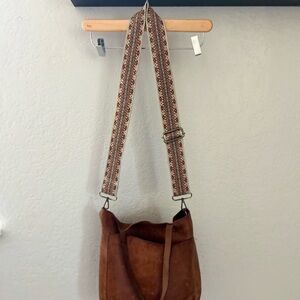 This classic brown leather tote bag is a wonderful carryall that I received countless compliments about. It's in well-loved condition and would benefit from a leather conditioning. I subbed the regular longer leather strap with this woven one--but I also still have the leather strap in perfect condition.