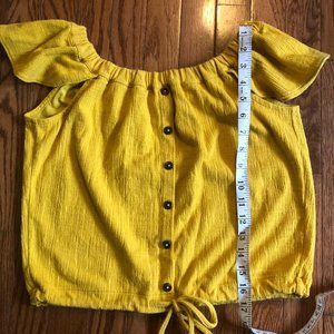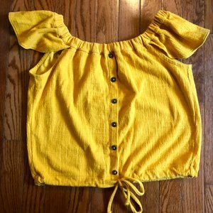 Super cute Madewell off-the-shoulder Texture and Thread top! Sexy and sweet—this off-the-shoulder top has flutter sleeves and buttons down the front. So good with high-risers and flares.