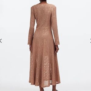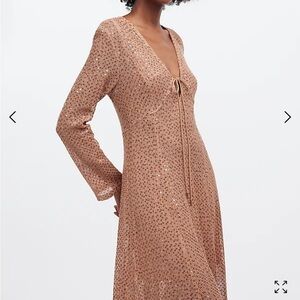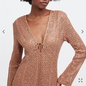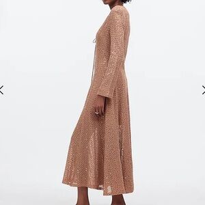 techniques while creating poetic, up-to-date and comfortable fashion. Finished with sparkling sequins, this maxi dress has a tie-front neckline and elegant long sleeves.