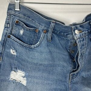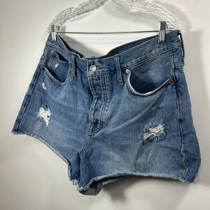 Madewell relaxed denim shorts size 32. Good condition. Button fly. Distressed. Raw hem. Inseam is 2.5” and rise is 12.5”. Laying flat waist is 19.5”