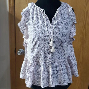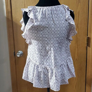 burgandy on white pattern ruffled with a flutter cap at shoulder sleeveless silk top size small by madewell excellent condition no issues