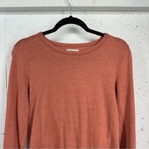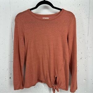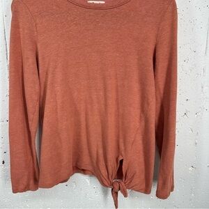 Madewell size Medium Soundcheck Side Orange Rust Tie Front Long Sleeve T Shirt in good preowned condition normal wear. I feel like it runs small for a medium see photos for measurements.