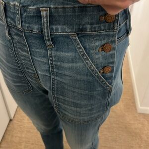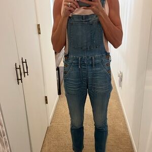 EUC. Stretch fit. Cropped. 3 buttons each side, pockets on sides and front. Belt loops all the way around. Size small. Waist measures 15" hips around 17". Straps adjust. Inseam approx 24".