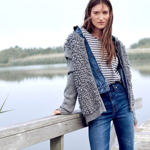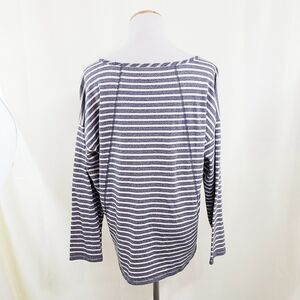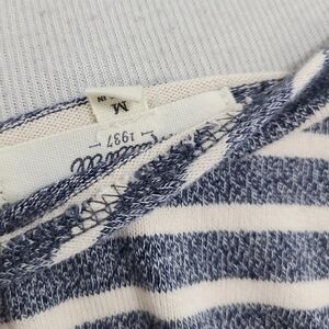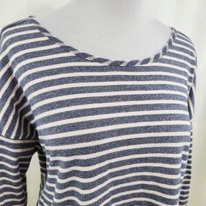 Madewell striped chart long sleeve tee. Dark navy blue and ivory / cream horizontal stripes. Raglan style sleeves. Oversized fit.