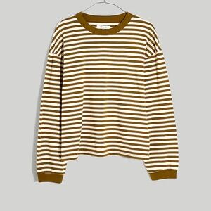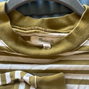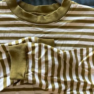 Olive green and cream colored striped long sleeve top size xxs. Sorry for the wrinkles. Nothing wrong with the item itself. Just Needs a good steam!