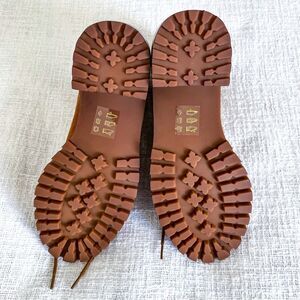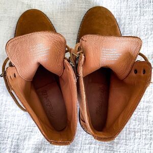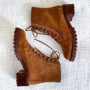 This listing is for a pair of suede combat boots from Madewell. They're crafted of brown suede leather and have a 5.25 inch shaft, lug sole, and 1.75 inch heel. This versatile pair goes with everything, from cropped wide-legs to every length dress. With little to no signs of wear, these boots are like NEW. They are a size 6 and fit true to size according to the website.